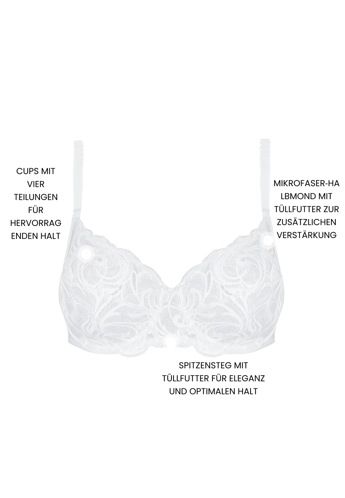 Carla ist eine tägliche Linie, die sowohl schick als auch bequem ist. Sie besteht aus feiner Spitze und weicher, satinierter Mikrofaser für einen zugleich schlichten und raffinierten Look. In tiefem Weiß verkörpert sie zeitlose Eleganz und betont Ihre Kurven für eine raffinierte und sinnliche Ausstrahlung.