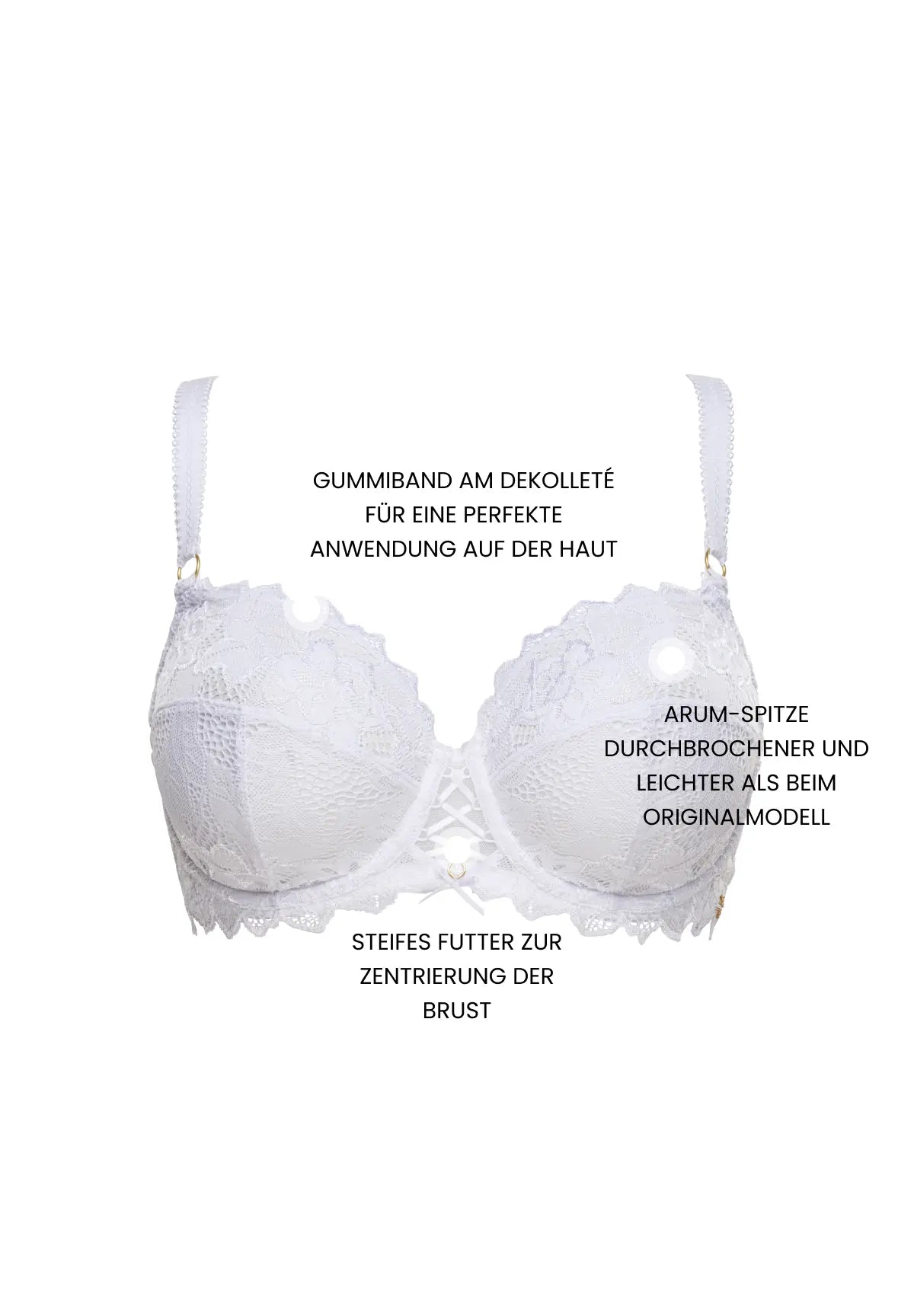 Spitze 88% Polyamid 12% Elasthan Gewebe 93% Polyamid 7% Elasthan Futter Schale 100% Polyester Futter Rücken 75% Polyamid 25% Elasthan Futter Vorderseite Mitte 100% Polyamid