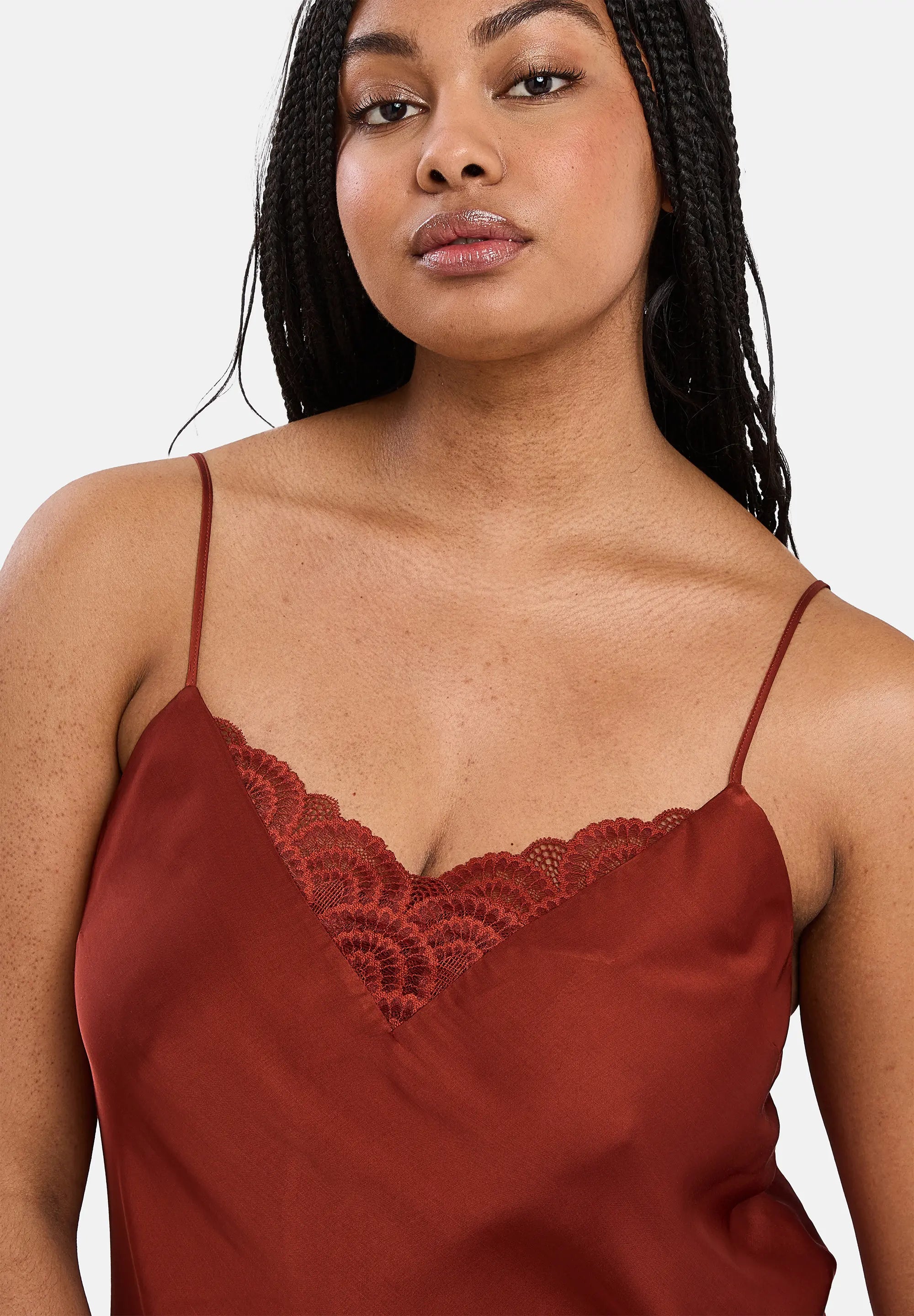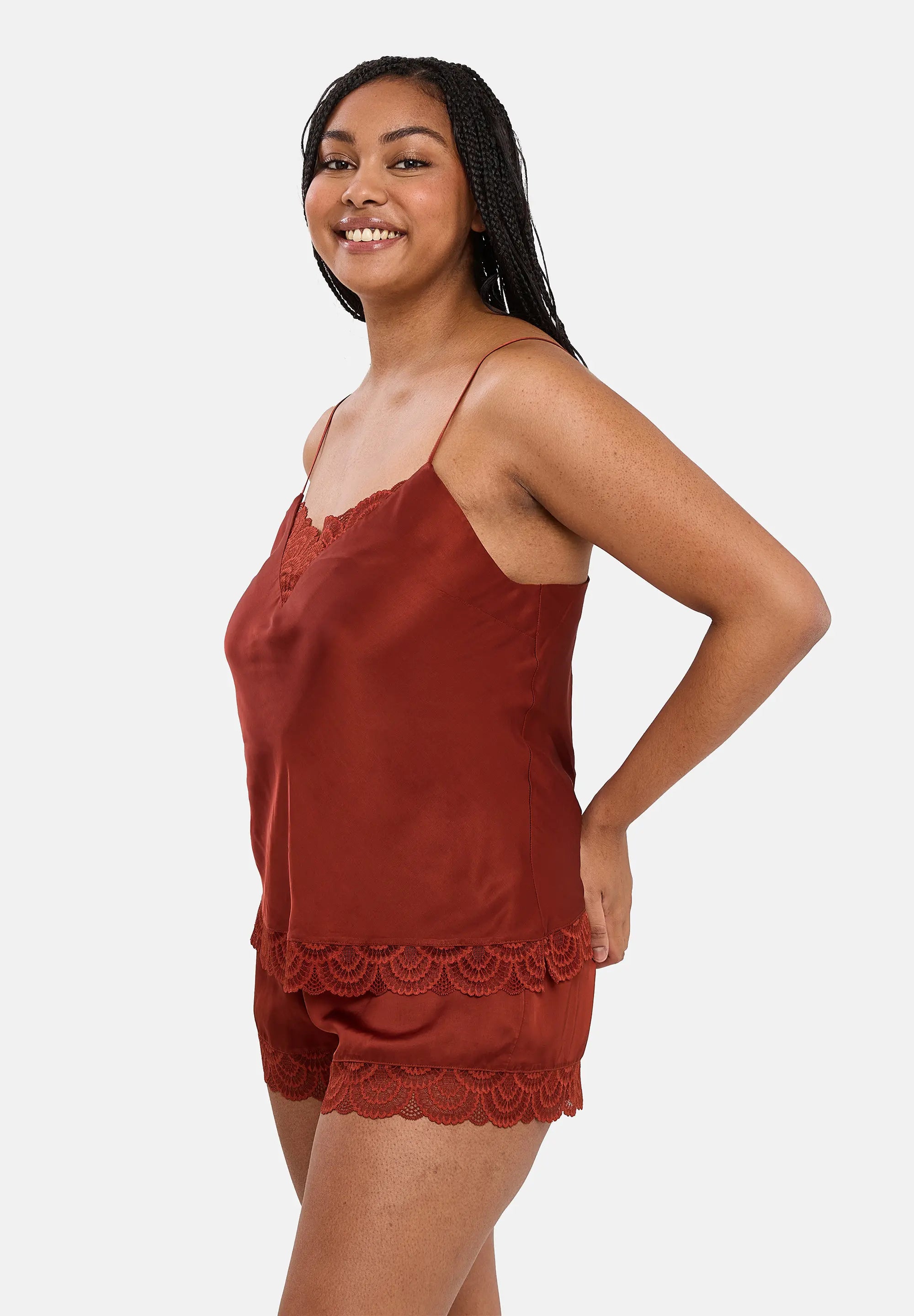 Adotta un aspetto elegante e confortevole con la linea Charming in raso di viscosa. Con il suo pizzo delicato e il colore uniforme, si abbina perfettamente con la stampa della linea Pure Chic per creare un look mix & match.