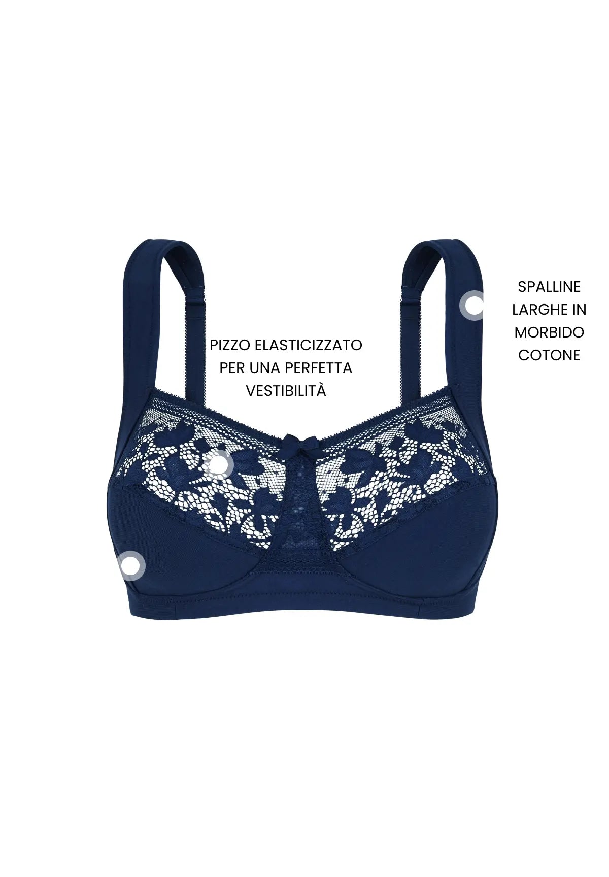 Tessuto 84% Cotone 16% Elastan Pizzo 81% Poliammide 19% Elastan Fodera spalline 100% Poliestere Fodera coppa 100% Cotone