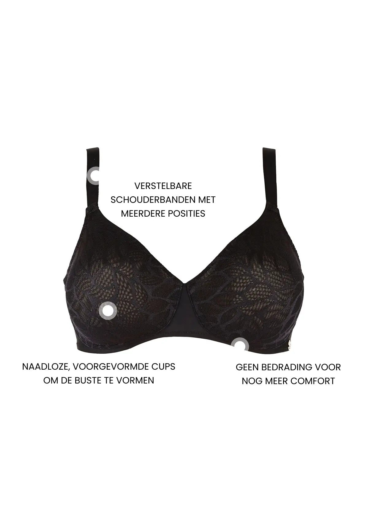 Het Perfect Curves-assortiment bh's wordt uitgebreid met dit model zonder beugel, dat comfortabele en altijd chique ondersteuning garandeert.