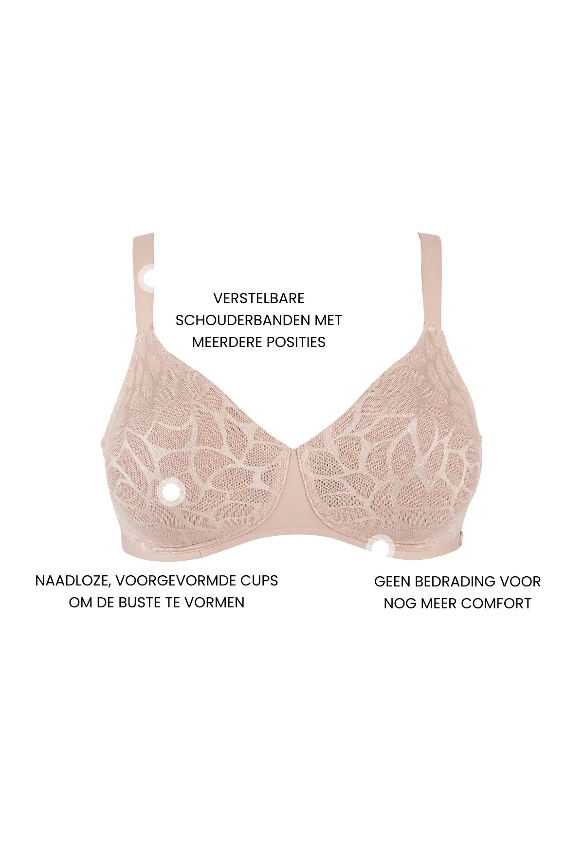 Het Perfect Curves-assortiment bh's wordt uitgebreid met dit model zonder beugel, dat comfortabele en altijd chique ondersteuning garandeert.