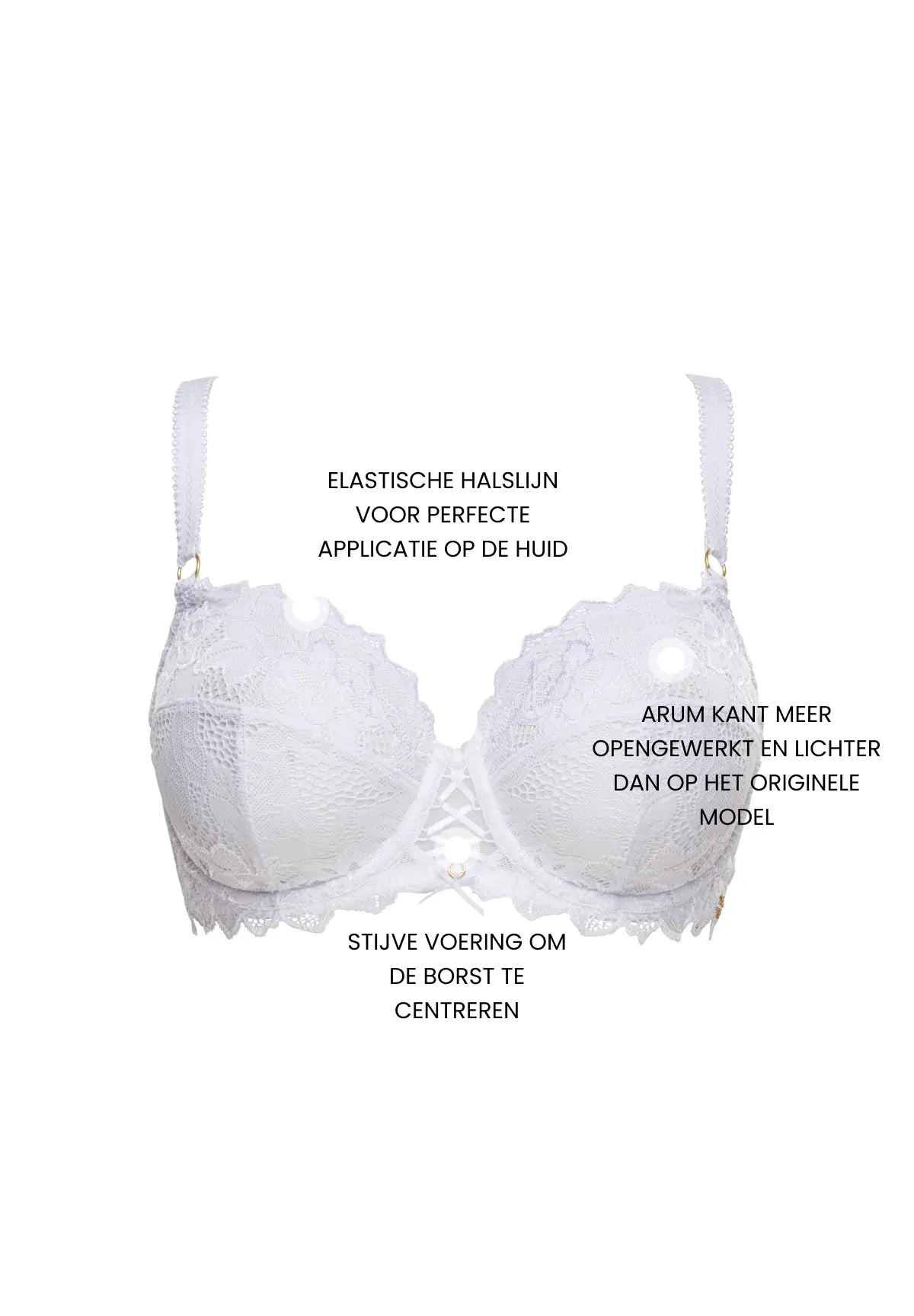 Arum Prima is de meer verfijnde versie van de iconische Sans Complexe Lingerie, verrijkt met chique details. Wat onveranderd blijft: de zorgvuldige constructie die het beste comfort en ondersteuning biedt tot aan de G-cup.