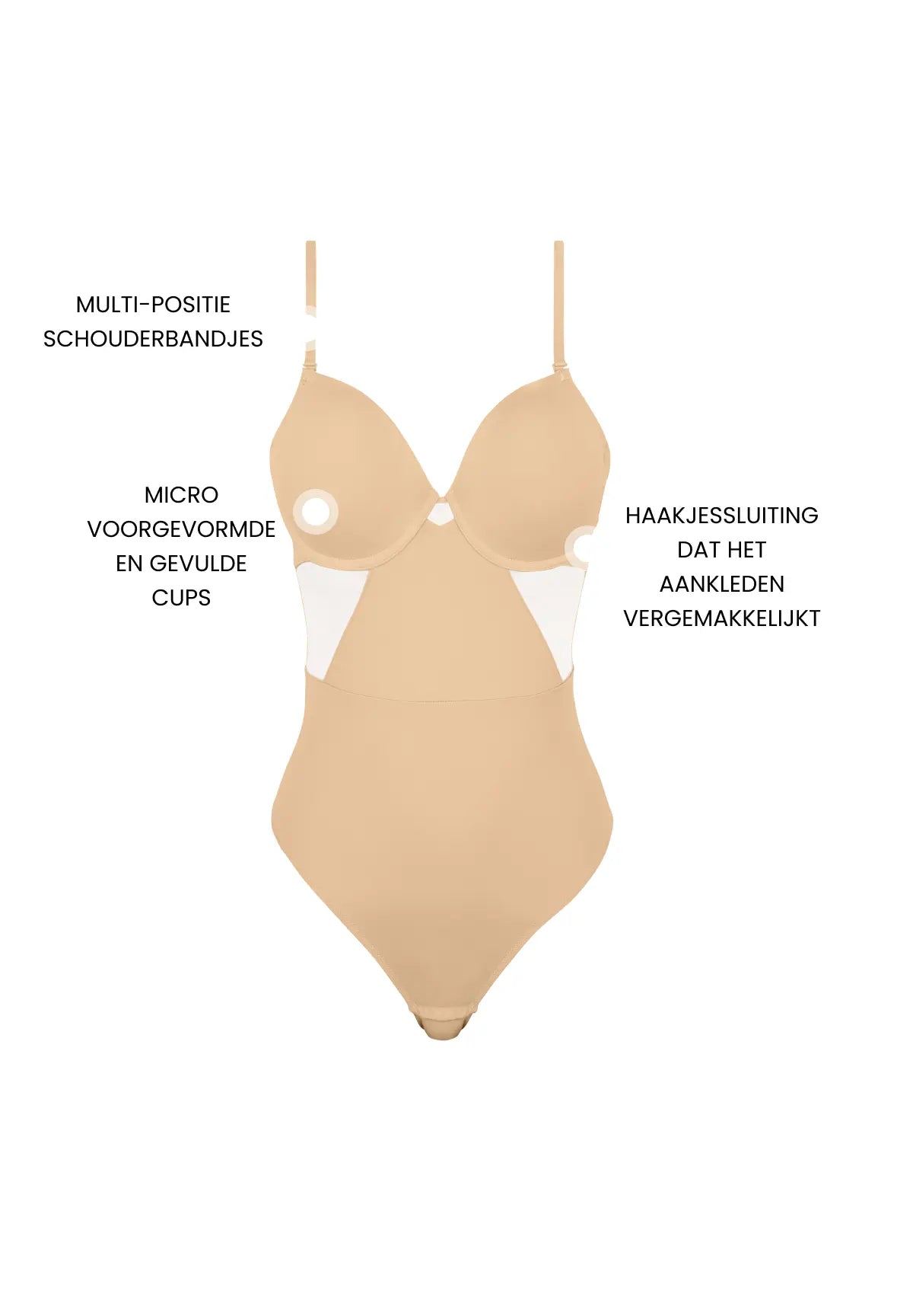 De ondersteuning van uw borst komt zowel door de bandjes als door de onderband van de beha of body. Omdat dit model een open rug heeft, raden we u sterk aan het met bandjes te dragen voor een optimale ondersteuning.