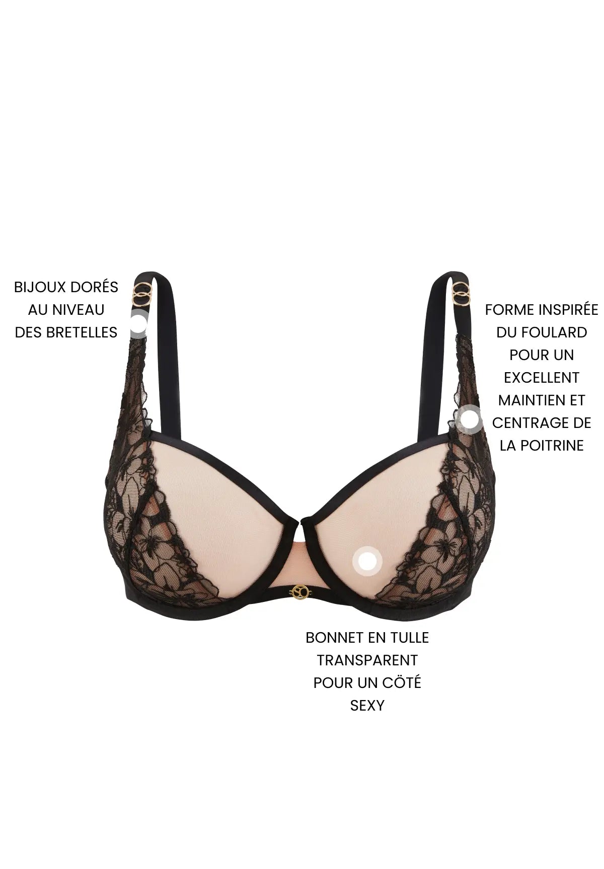Deva est la ligne séduction affirmée et moderne. Sa broderie florale fine et élégante, ses jeux de contrastes et ses bijoux dorés lui donne un look sexy et raffiné.