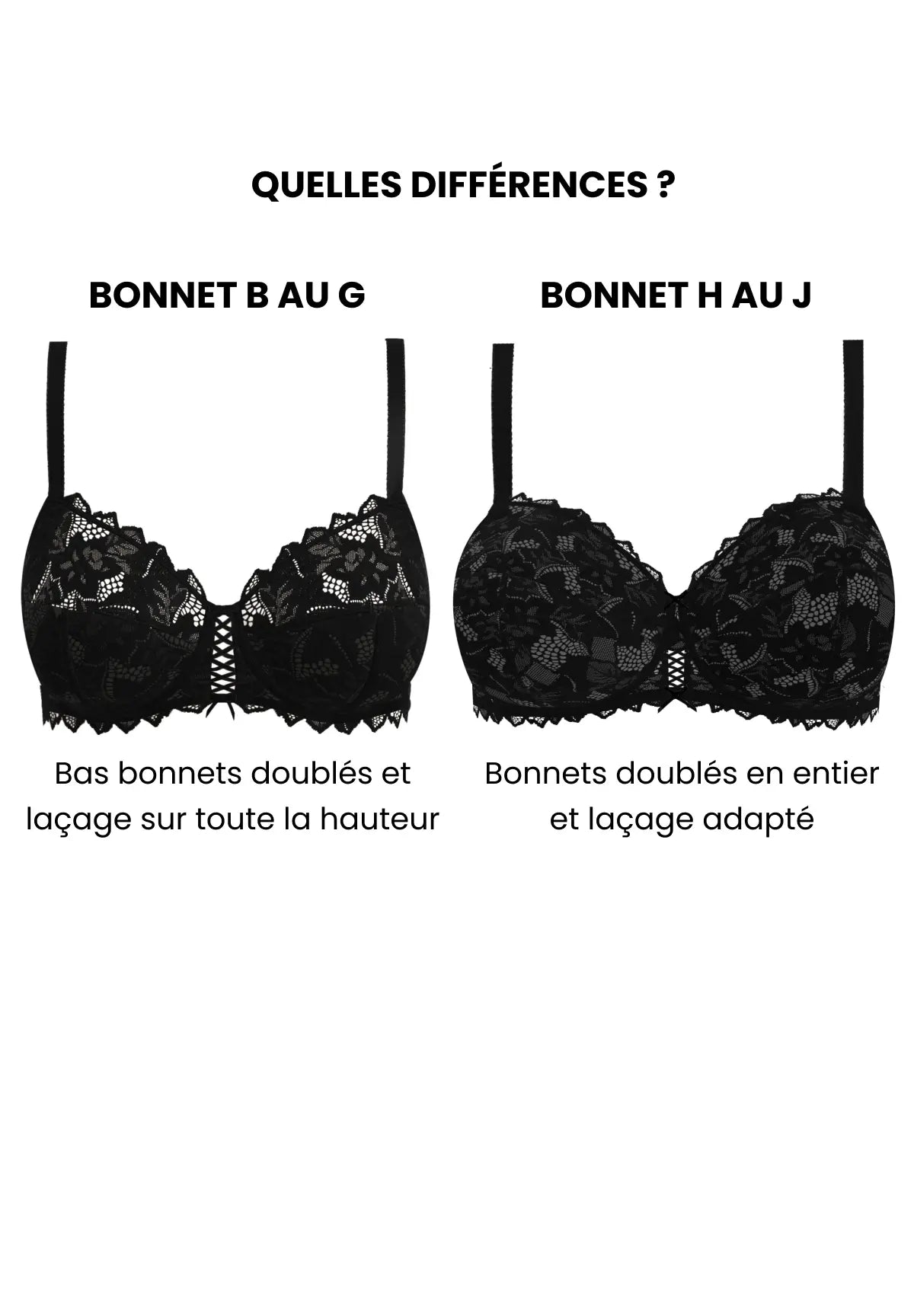 Les bonnets H, I et J bénéficient d’un entre-seins repensé pour un maintien adapté aux fortes poitrines.